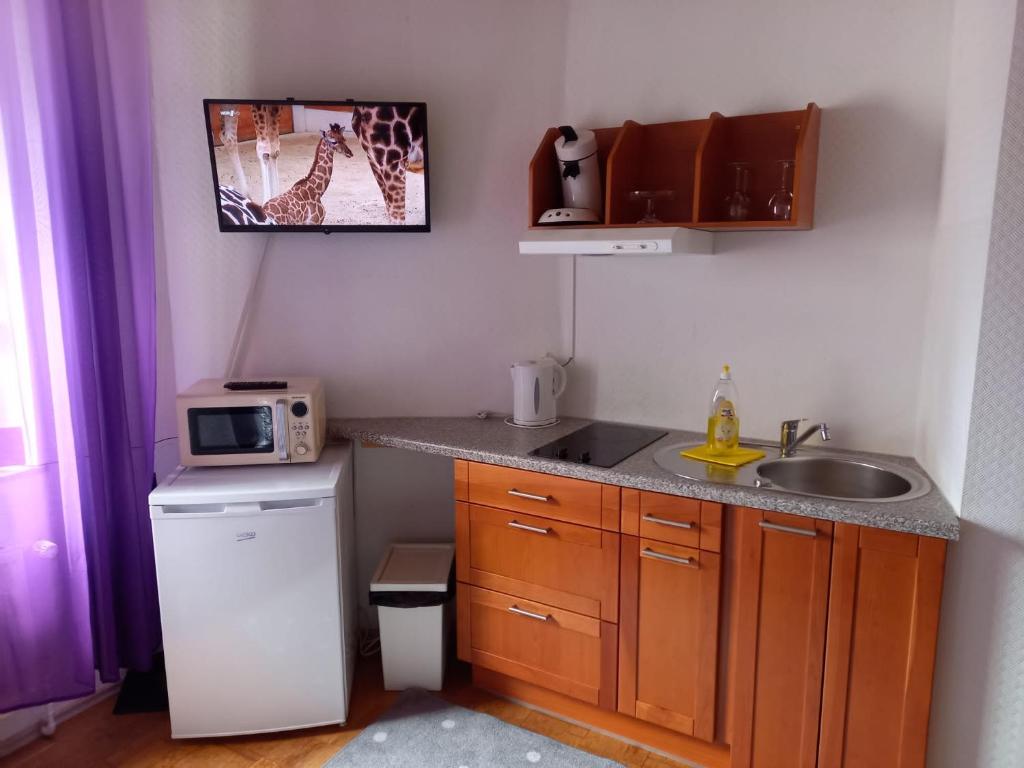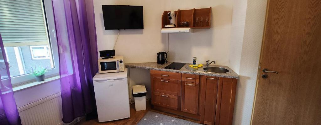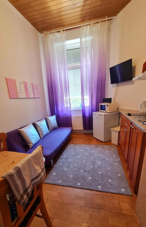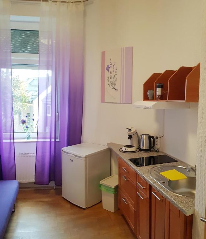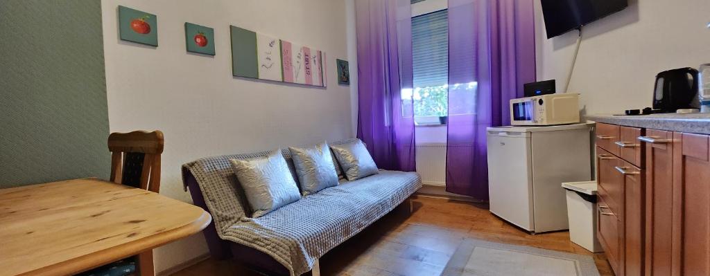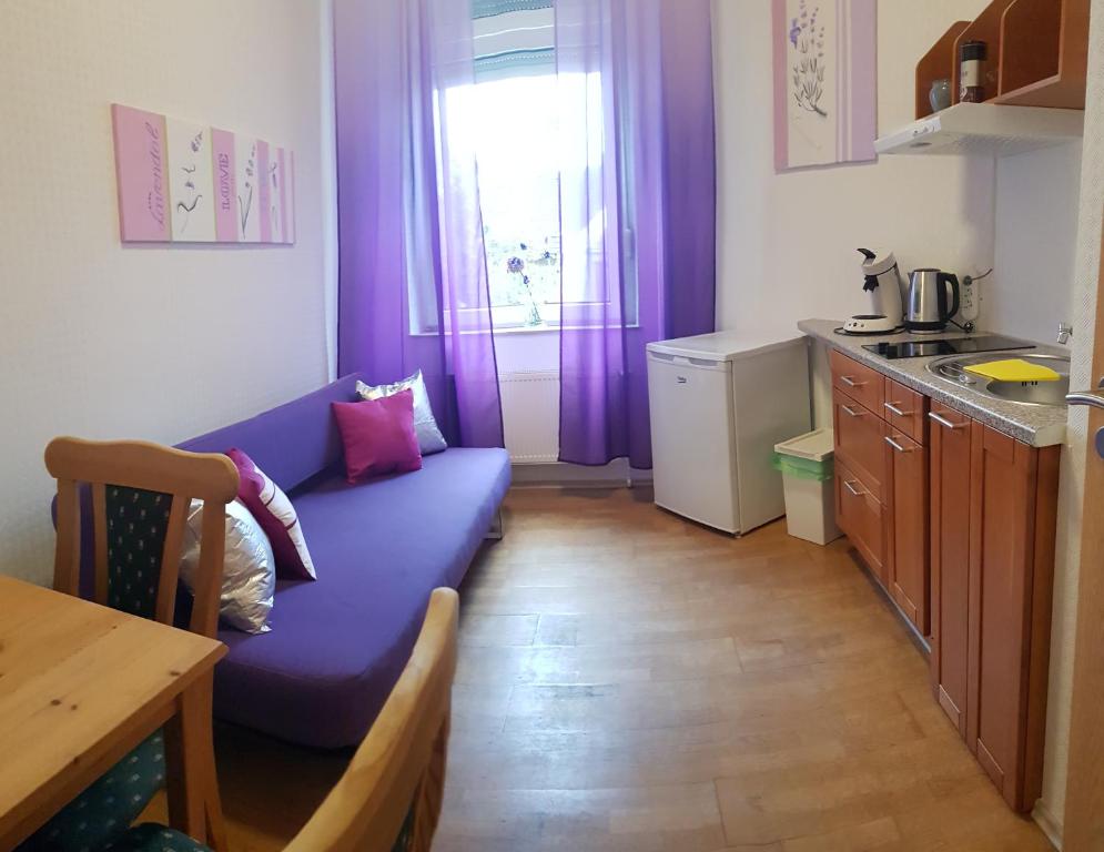 Cozy one-bedroom ELENA flat Lavendel in Duisburg Zentrum features a living room, kitchenette with coffee machine, microwave, stovetop, washing machine, and free WiFi. Pet-friendly, ideal for solo travellers or couples.